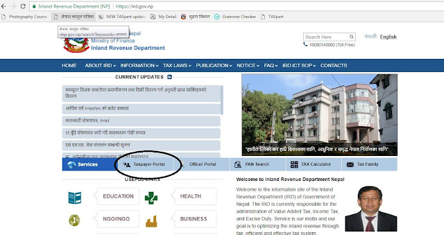 सर्बप्रथम आन्तरीक राजस्व विभागको वेवसाईट www.ird.gov.np मा जानुहोस । तपाइले निम्न किसिमको पेज देख्नुहुन्छ । त्यसपछि, बिचमा रहेको Taxpayer Portal मा क्लिक गर्नुहोस ।