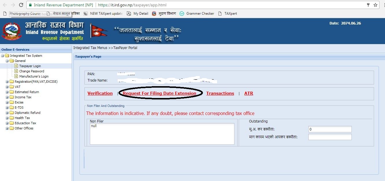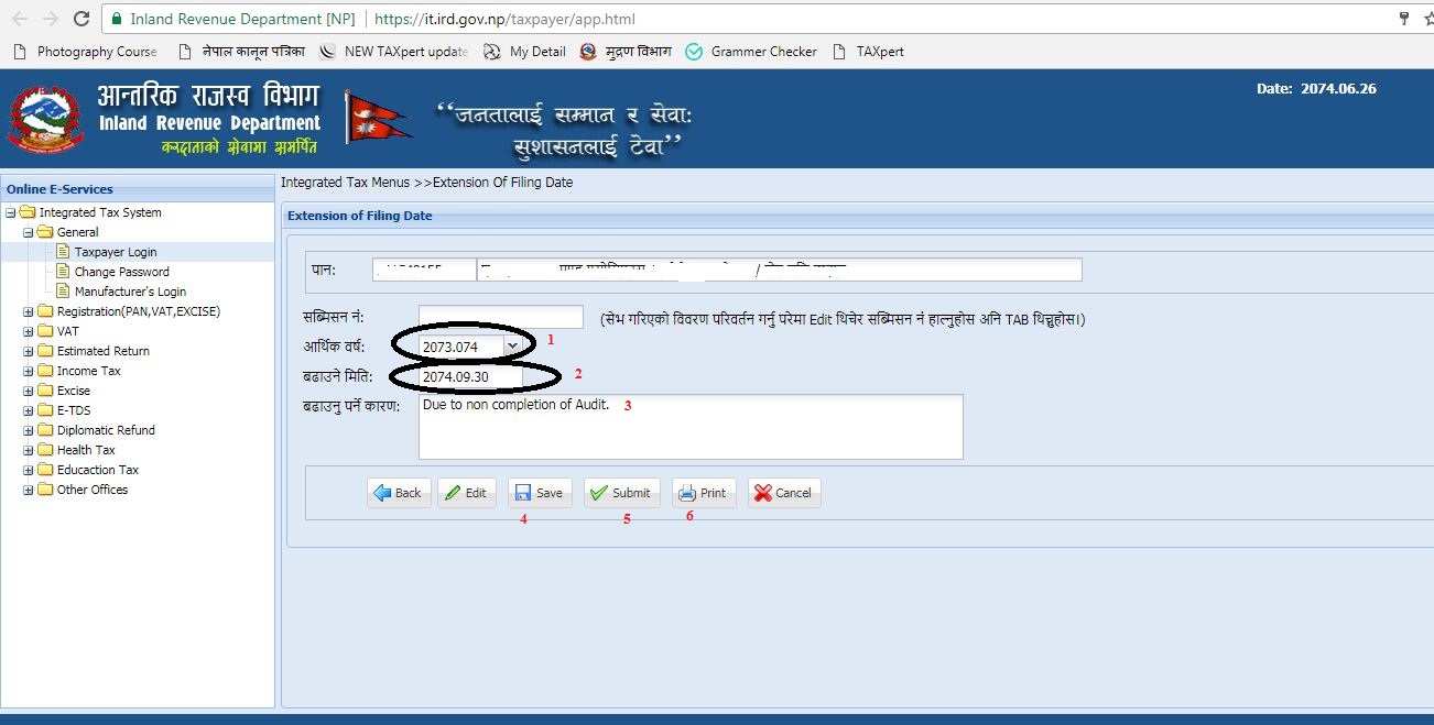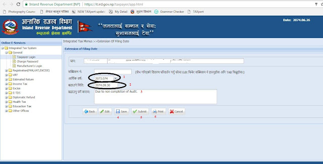 अब फोटोमा देखाएजस्तै गरि, आर्थिक बर्ष २०७३.७४ हाल्नुहोस । बढाउनु पर्ने मिति, कहिले सम्म चाहिने हो, सो भर्नु होस्, तर याद राख्नुहोस् यो मिति पौष मसान्तभन्दा उता हुनु हुदैन र त्यसपछी बढाउनु पर्ने कारण के हो, सो पनि उल्लेख गर्न नाभुल्ल्नु होला । यहि कारणको आधारमा कर अधिकृतले तपाईको म्याद थप गर्ने नगर्ने निर्णय लिन सक्छन ।