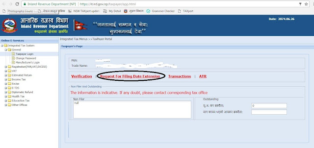 सामान्यतयाः हाल कर कार्यालयले कागजमा लेखेर म्याद थप गर्न पेश गरेको निवेदन स्विकार गर्न छोडिसकेको छ । यसको लागि अनिबार्य रुपले अनलाईनबाट निबेदन पेश गर्नुपर्ने हुन्छ । यस लेखमा हामी सो निवेदन कसरी पेश गर्ने भन्नेबारे प्रकृयागत रुपमा उल्लेख गर्नेछौं ।