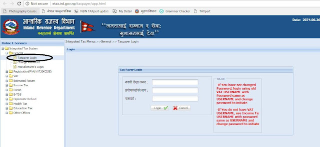 त्यसपछि, माथि देखाएझैँ पेज खुल्नेछ । अब तपाइले कर कार्यालयबाट उपलब्ध गराएको Username र Password हालेर आफ्नो करको एकाउन्ट खोल्न सक्नुहुन्छ । यो username र password लिन कर कार्यालयमा नै सम्पर्क राख्नु पर्ने हुन्छ । यदि तपाई भ्याटमा दर्ता हुनुहुन्छ भने पक्कै पनि तपाइले यो username र password लिसकेको हुनुपर्छ ।